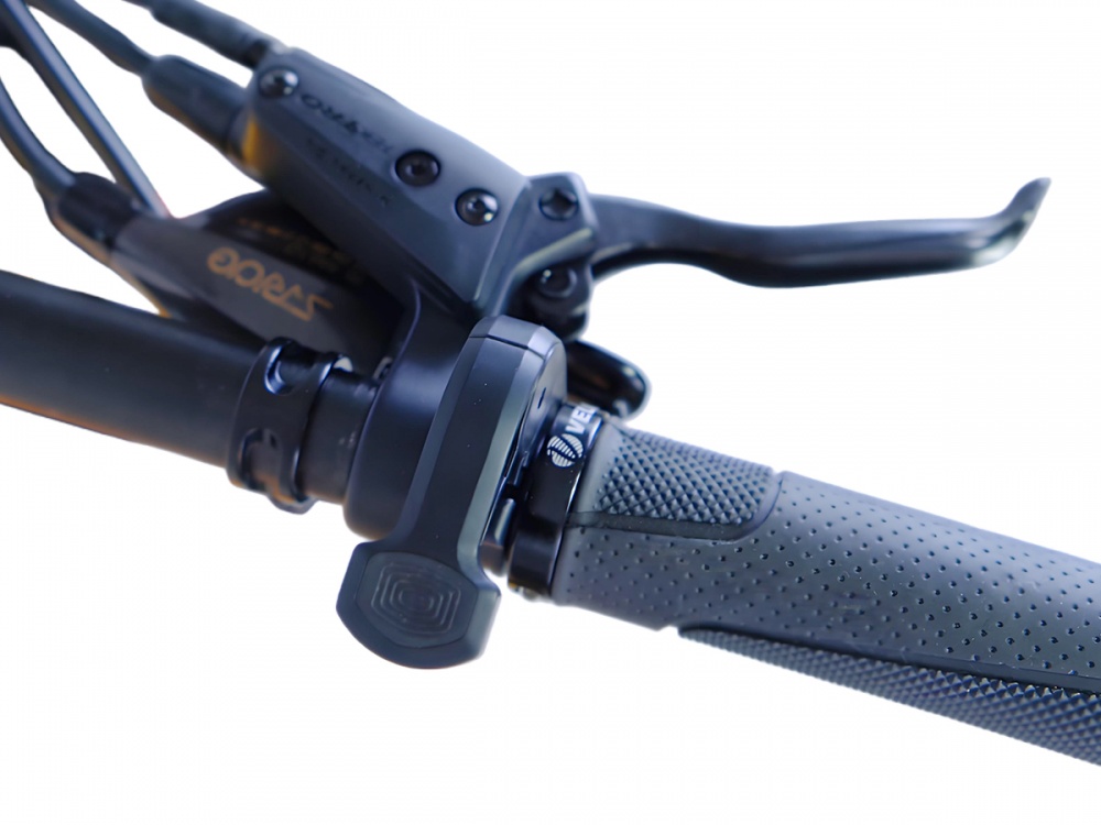 A thumb throttle mounted on the left handlebar,near display switches